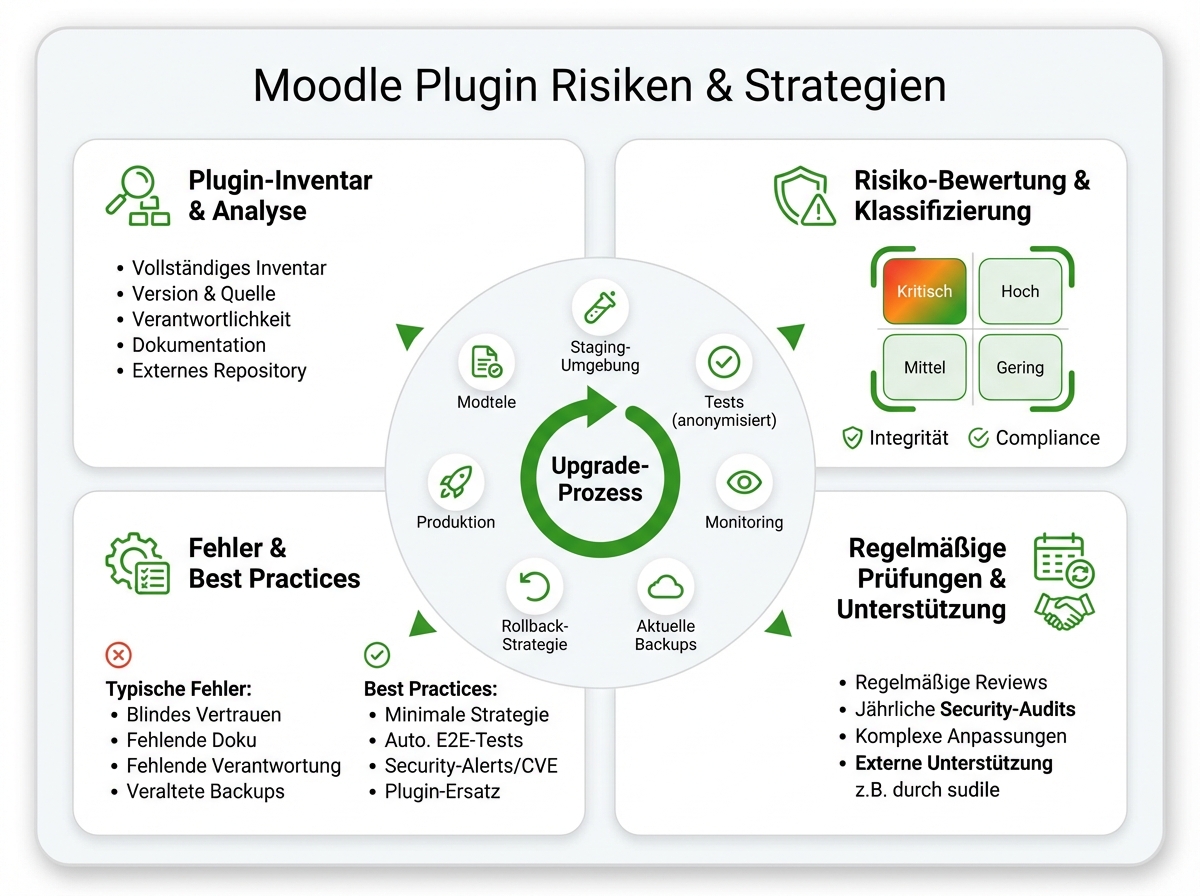 • Plugin-Inventar und Kompatibilitätscheck sind die Basis für jedes Moodle-Upgrade.