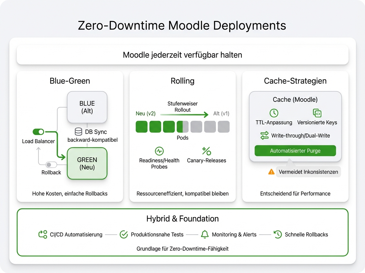 Echte Zero-Downtime gelingt nur mit einer Kombination aus CI/CD-Automatisierung (inkl. Rollback), Health-Checks/Readiness-Probes, Monitoring mit Alerts sowie produktionsnahen Tests. Für komplexe Moodle-Umgebungen sind häufig Hybrid-Ansätze (Blue-Green für Major-Updates, Rolling für Hotfixes) am robustesten.