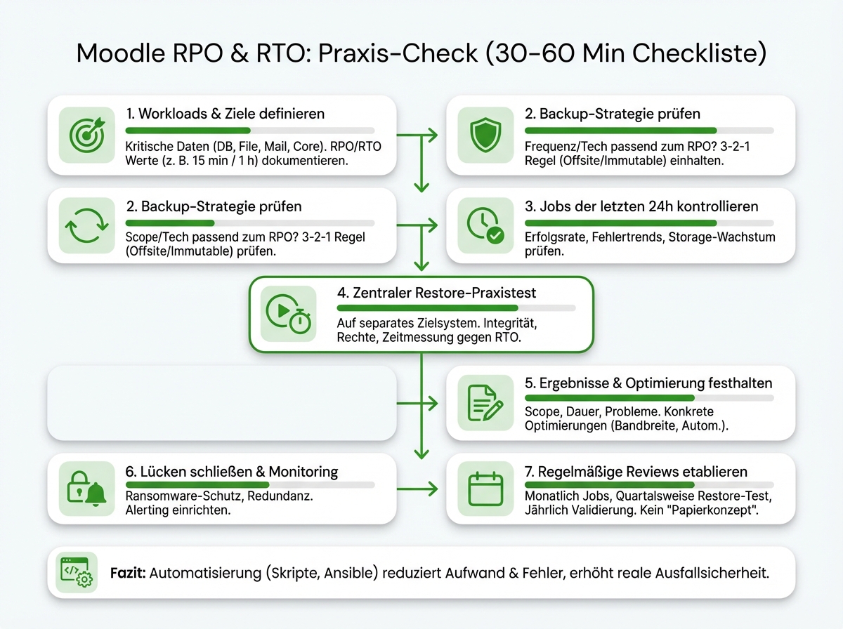 Unsere kompakte Praxis-Checkliste zeigt DevOps und Moodle-Admins, wie sie in 30–60 Minuten mit gezielten Schritten nachvollziehen, bewerten und dokumentieren, ob RPO/RTO realistisch erreichbar sind – und wie sich Prozesse pragmatisch optimieren lassen. Dabei verweist sie stets auf verbreitete Best Practices (Quelle 1, Quelle 2, Quelle 3).