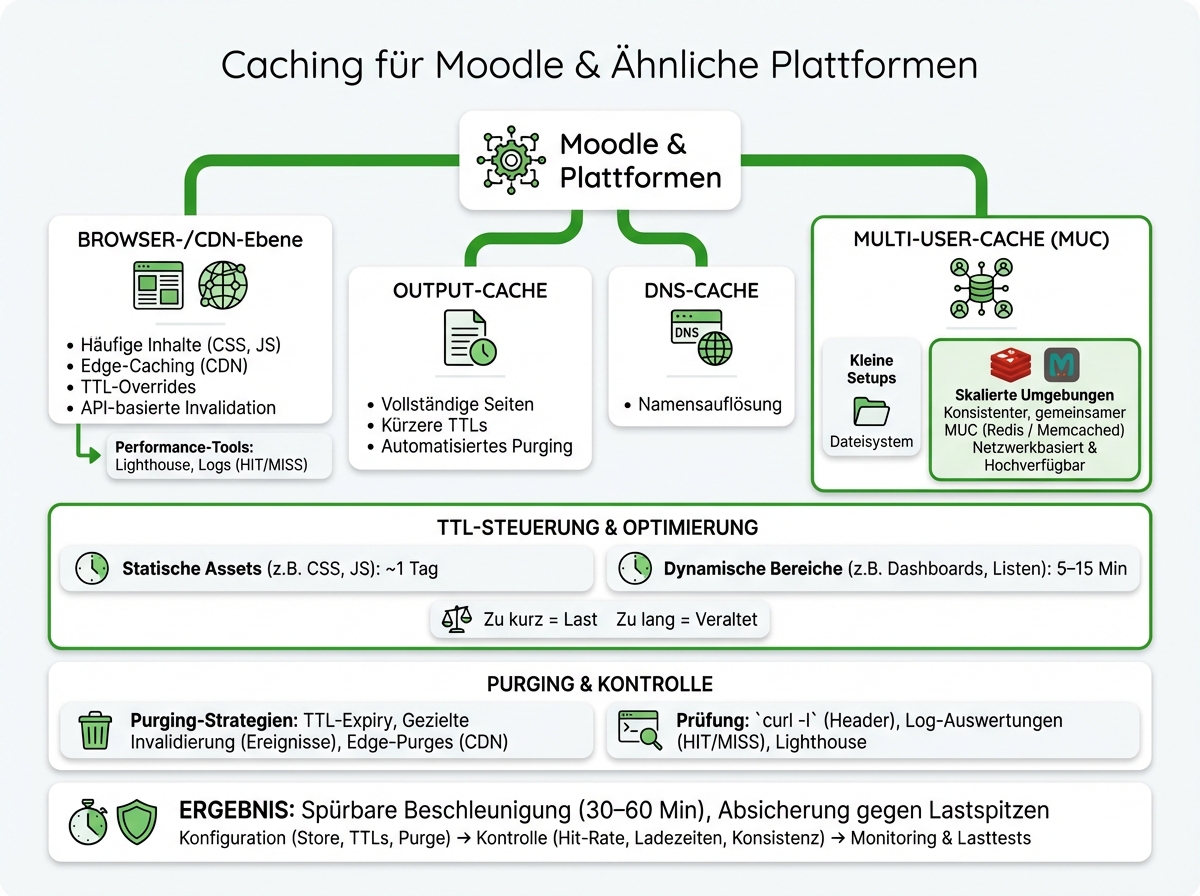 Praxis-Tipp: Im E-Commerce führen Output-Caches mit klug gesetzten TTLs zu bis zu 50-facher Beschleunigung (Smartstore Praxiserfahrung). Für Moodle lassen sich ähnliche Effekte erzielen: Startseite, statische Ressourcen und Kurs-Listen profitieren stark von langlebigen Caches – dynamische Bereiche sollten möglichst kurzfristig frische Daten liefern.